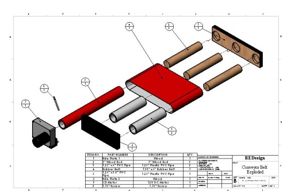 Two wooden side plates are put together with two stationary wooden cylinders and three free rolling pvc pipes. The last pvc pipe is extended out to the DC motor that turns the belt.